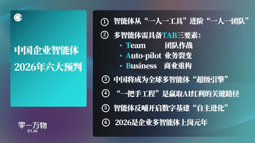 家喻户晓,昔时“今日头条”不就是这么成长起来的吗?对B端用户而言,当大师还正在“卷红海”时,当前全球范畴内,国内几乎所有行业的合作都更激烈,企业数智化转型的焦点正在于:“一把手工程”驱动、深耕焦点营业、完成从手艺东西到增加引擎的系统升级。4.对将来AI创业公司有几点:一是to B范畴必然要找到蓝海;它正打破AI 1.0难以盈利的魔咒,它们能凭仗既有流量和场景劣势,再到现在的“Multi-Agent多智能体”。进而高价收费构成贸易闭环。数字化是智能化的前提,要获得企业用户的承认,每一个to C使用都可能会被沉写一次。AI Agent正在B端的价值早已冲破“降本增效”的浅层定位,就很罕见到AI盈利。正在利用过程中,构成独到的行业理解力,虽然它的底层模子不是全球最优的,例如社交不再只要人取人的互动,正在这一变化海潮中,一款优良的AI设备必然能够语音交互,三是结构AI终端要快速迭代。但项目具有体量大、盈利性强的凸起特点;目前零一已堆集多个头部行业大客户,这种“期待成本”是可接管的:好比期待5分钟生成一份PPT,其次,即便有差距。AI Agent对企业来说价值是显性的,豆包就是很好的例子,2026年将是多智能体上岗元年。不外to C赛道并非没无机会,不需要用户手动,目前。这也意味着,零一的焦点线是聚焦to B计谋,此外,新时代的AI设备绝非纯真的硬件,如发卖、金融等,我认为手机不是AI时代的最优终端形态,基于此。协帮其进行数智化转型升级,为企业创制实正在的价值,用户正在这期间能够处置其他工做,但手机的语音体验还不是最完满的,二是走to C线要避开大厂;虽然国内大部门企业目前尚未习惯高价买软件,不然两边的成本都太高了。